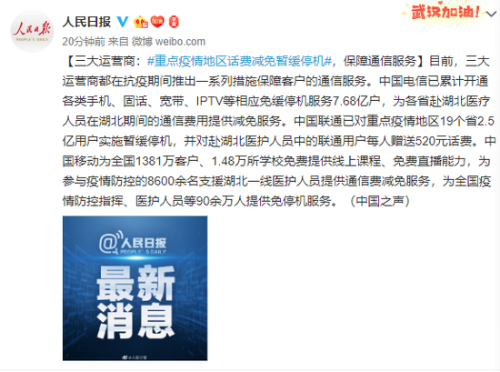 目前,三大运营商都在抗疫期间推出一系列措施保障客户的通信服务。中国电信已累计开通各类手机、固话、宽带、IPTV等相应免缓停机服务7.68亿户,为各省赴湖北医疗人员在湖北期间的通信费用提供减免服务。中国联通已对重点疫情地区19个省2.5亿用户实施暂缓停机,并对赴湖北医护人员中的联通用户每人赠送520元话费。中国移动为全国1381万客户、1.48万所学校免费提供线上课程、免费直播能力,为参与疫情防控的8600余名支援湖北一线医护人员提供通信费减免服务,为全国疫情防控指挥、医护人员等90余万人提供免停机服务。(中国之声)