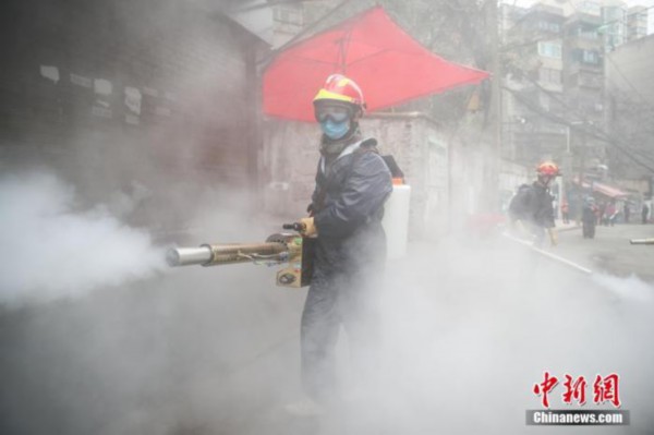 2月7日,为应对新型冠状病毒感染的肺炎疫情,贵阳市云岩区一社区的公共区域正进行消毒杀菌。中新社记者 瞿宏伦 摄