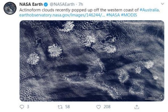 据报道,NASA的Aqua卫星在1月29日捕捉到了这种令人叹为观止的景色,而该航天局的地球观测站在社交媒体上分享了这张图像。据悉,这些云出现在澳大利亚西海岸。