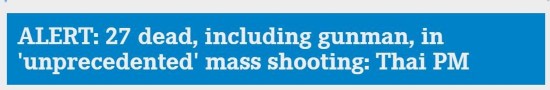 【环球网快讯】法新社援引泰国总理巴育的话称,8日发生的枪击事件造成包括枪手在内的27人死亡。