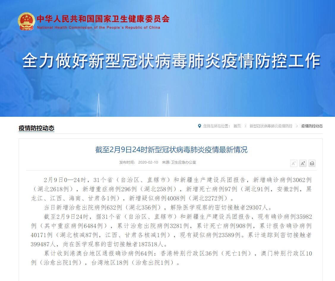 截至2月9日24时,据31个省(自治区、直辖市)和新疆生产建设兵团报告,现有确诊病例35982例(其中重症病例6484例),累计治愈出院病例3281例,累计死亡病例908例,累计报告确诊病例40171例(湖北核减87例,江西、甘肃各核减1例),现有疑似病例23589例。累计追踪到密切接触者399487人,尚在医学观察的密切接触者187518人。