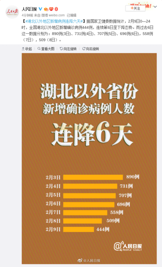 据国家卫健委数据统计,2月9日0—24时,全国湖北以外地区新增确诊病例444例,连续第6日呈下降态势。而过去6日这一数据分别为:890例(3日)、731例(4日)、707例(5日)、696例(6日),558例(7日),509(8日)。