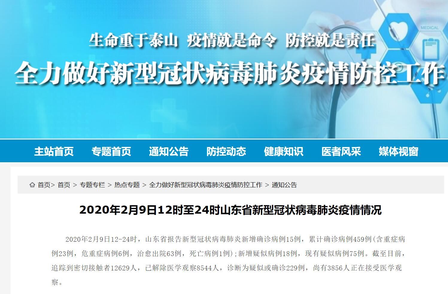 荔枝新闻讯 据山东省卫生健康委员会官网消息,2020年2月9日12-24时,山东省报告新型冠状病毒肺炎新增确诊病例15例,累计确诊病例459例(含重症病例23例,危重症病例6例,治愈出院63例,死亡病例1例);新增疑似病例18例,现有疑似病例75例。截至目前,追踪到密切接触者12629人,已解除医学观察8544人,诊断为疑似或确诊229例,尚有3856人正在接受医学观察。#全国累计确诊40171例新冠肺炎