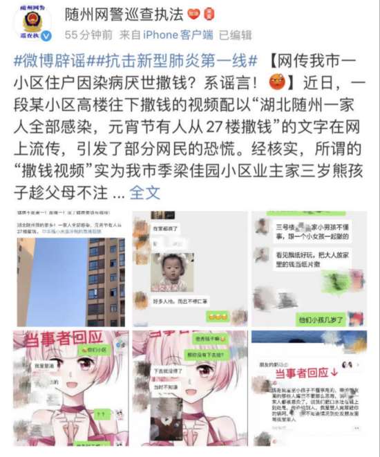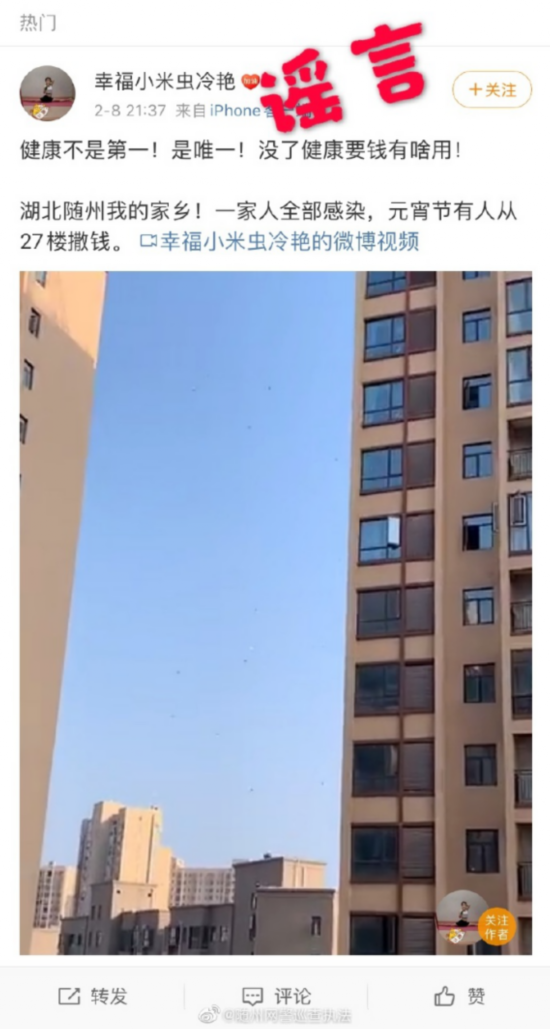 荔枝新闻讯 近日,一段某小区高楼往下撒钱的视频配以“湖北随州一家人全部感染,元宵节有人从27楼撒钱”的文字在网上流传,引发部分网民恐慌。10日下午,随州市公安局网络安全保卫支队在官方微博对此辟谣:系谣言。