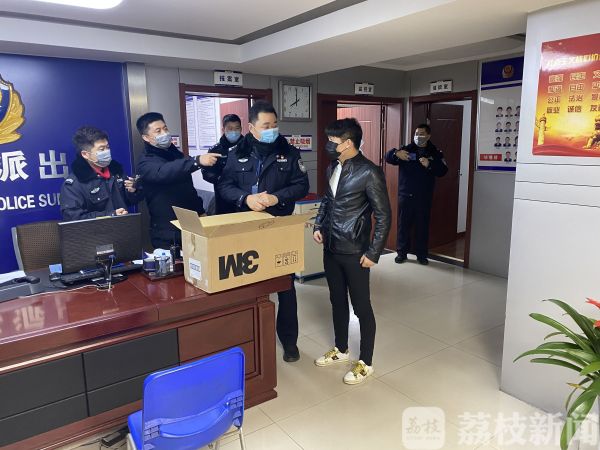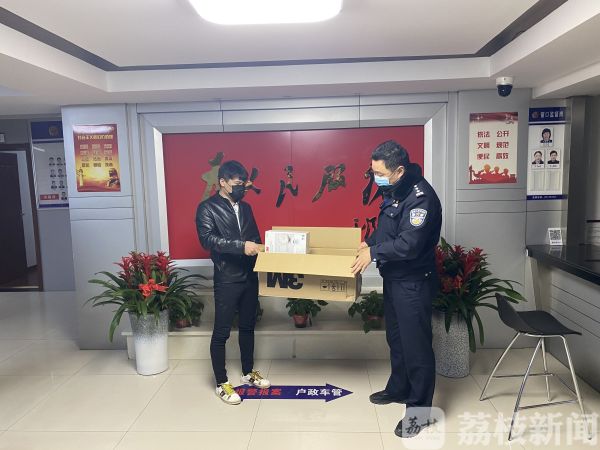 2月9日晚,南京秦淮区建康路派出所大厅走进一位戴口罩的黑衣男子,他将一个纸箱放在大厅的前台,转身就要离开,被值班民警一把拽住。