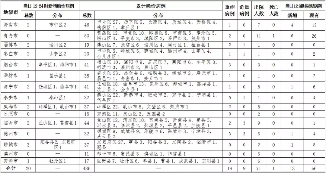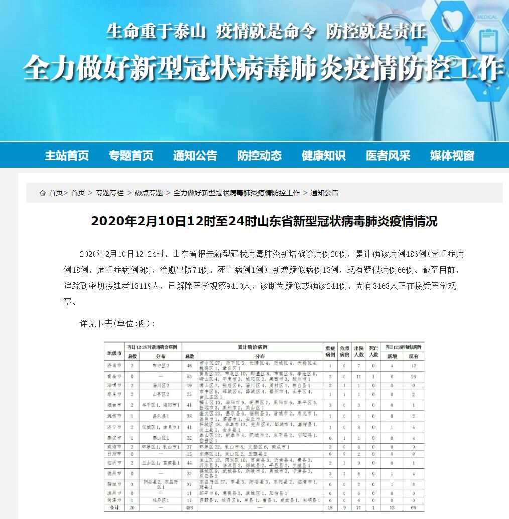 荔枝新闻讯 据山东卫健委官方网站消息,2020年2月10日12—24时,山东省报告新型冠状病毒肺炎新增确诊病例20例,累计确诊病例486例(含重症病例18例,危重症病例9例,治愈出院71例,死亡病例1例);新增疑似病例13例,现有疑似病例66例。截至目前,追踪到密切接触者13119人,已解除医学观察9410人,诊断为疑似或确诊241例,尚有3468人正在接受医学观察。