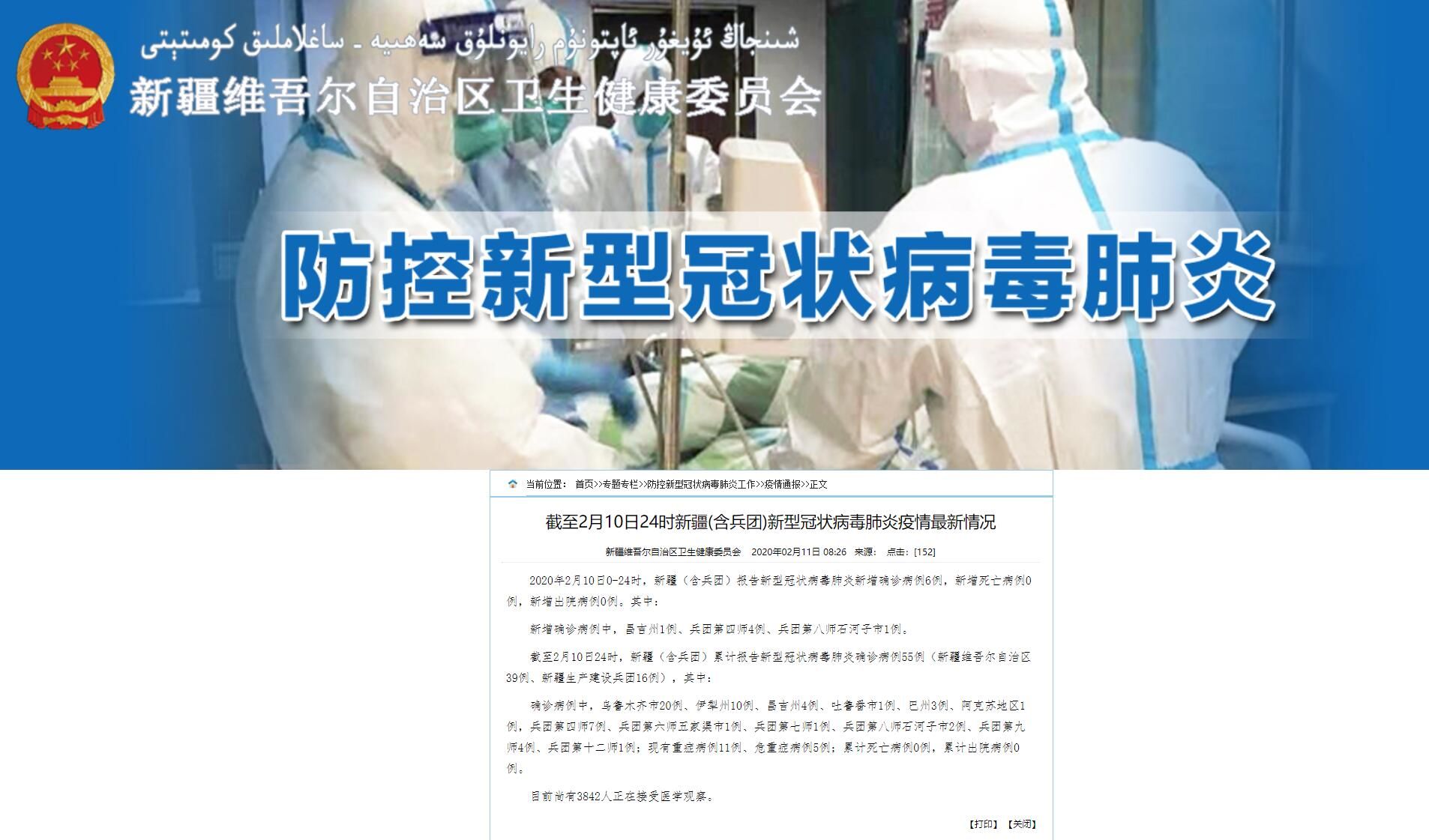 荔枝新闻讯 据新疆卫健委官方网站消息,2020年2月10日0—24时,新疆(含兵团)报告新型冠状病毒肺炎新增确诊病例6例,新增死亡病例0例,新增出院病例0例。其中: