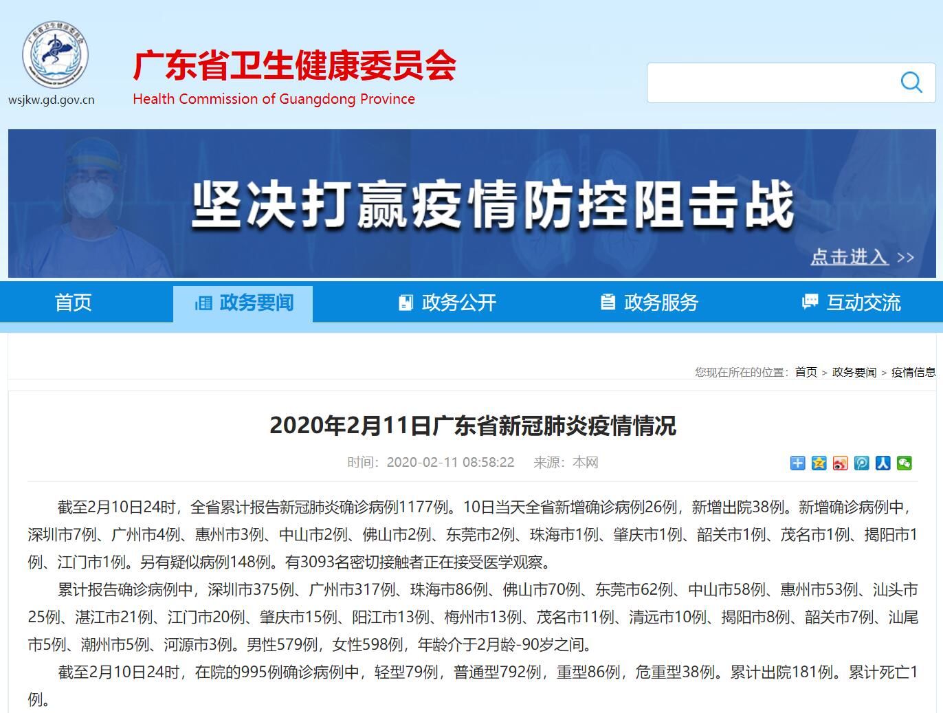 荔枝新闻讯 据广东卫健委官方网站消息,截至2月10日24时,广东省累计报告新冠肺炎确诊病例1177例。10日当天广东省新增确诊病例26例,新增出院38例。新增确诊病例中,深圳市7例、广州市4例、惠州市3例、中山市2例、佛山市2例、东莞市2例、珠海市1例、肇庆市1例、韶关市1例、茂名市1例、揭阳市1例、江门市1例。另有疑似病例148例。有3093名密切接触者正在接受医学观察。