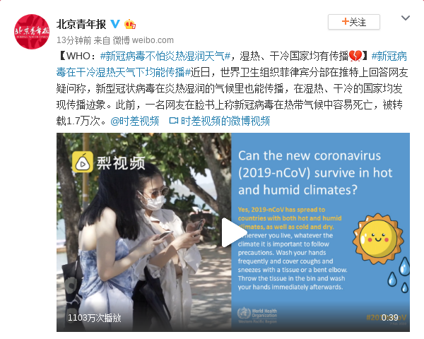 新冠病毒在干冷湿热天气下均能传播。近日,世界卫生组织菲律宾分部在推特上回答网友疑问称,新型冠状病毒在炎热湿润的气候里也能传播,在湿热、干冷的国家均发现传播迹象。此前,一名网友在脸书上称新冠病毒在热带气候中容易死亡,被转载1.7万次。