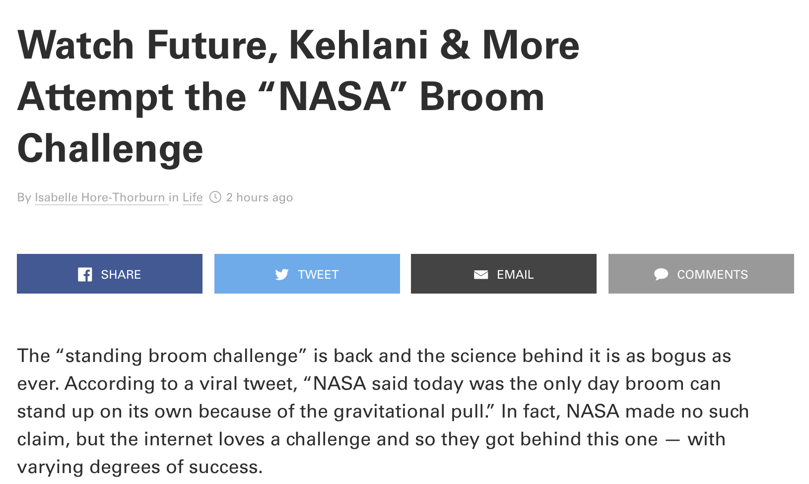 荔枝科技也赶紧电话请教了中国科学院紫金山天文台科普部主任张旸,请他分析一下这条流言的真伪?地球上是否可能有一天,某一个角落,扫把、金箍棒或者别的什么东西都能立起来?