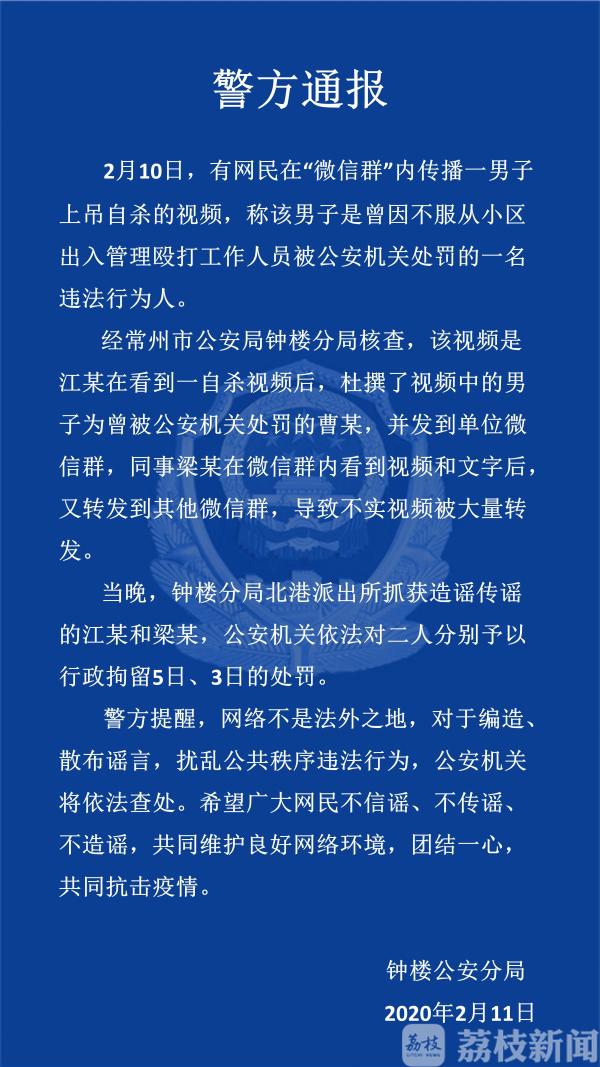 2月10日当晚,钟楼分局北港派出所出动,抓获了造谣传谣的江某和梁某。公安机关依法对二人分别予以行政拘留5日、3日的处罚。