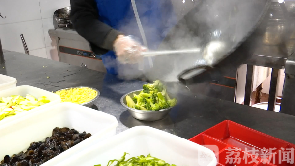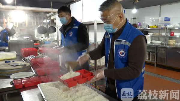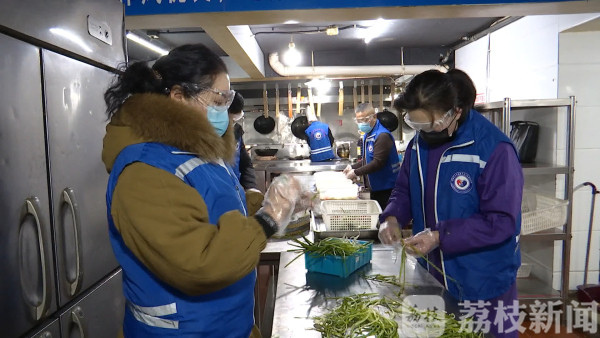 在阜宁县哈尔滨路上一家餐厅的厨房里,志愿者们早已在厨房间忙活开了。厨师挥动大勺,两位志愿者摘菜、洗菜、切菜,每道工序正有条不紊地进行着,不一会儿,阵阵菜香扑鼻而来。