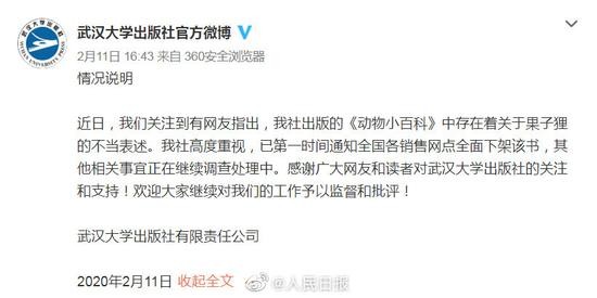 荔枝新闻讯 近日,有网友指出武汉大学出版社出版的《动物小百科》中存在关于果子狸的不当表述。武汉大学出版社有限责任公司11日回应表态,已第一时间通知全国各销售网点全面下架该书,其他相关事宜正在继续调查处理中。