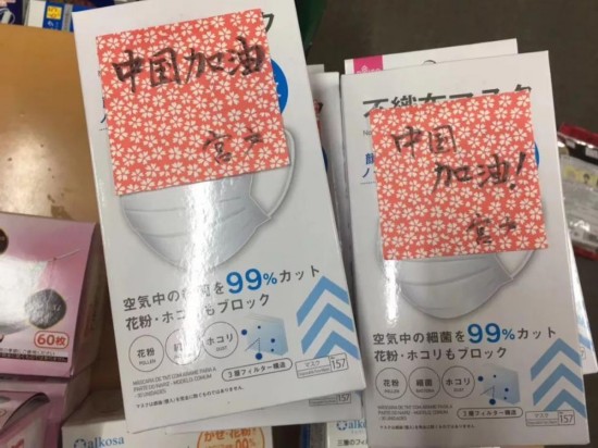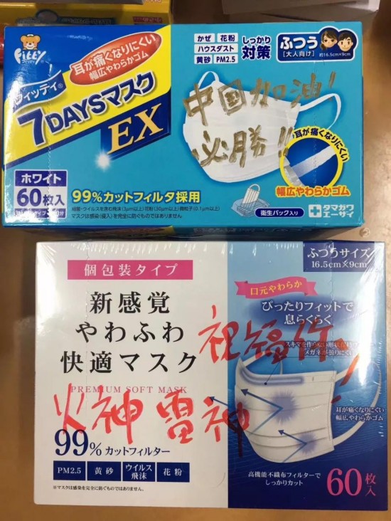 他们在自己捐赠的口罩上写有“中国加油!“身体健康,加油吧!”“祝福你,火神雷神!”等应援口号。
