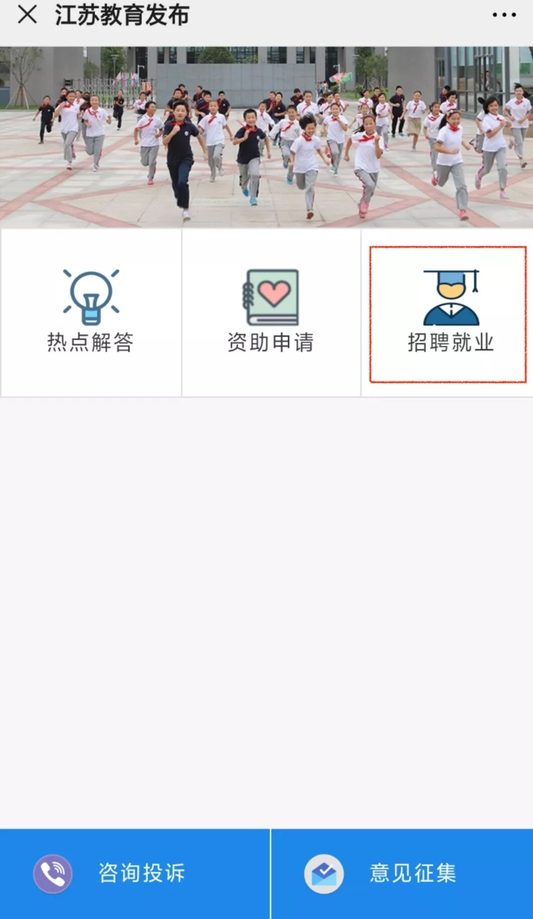 通过“江苏教育发布”微信公众平台下方的“微服务”按钮,找到“招聘就业”图标,点击可进入“91job智慧就业平台”。