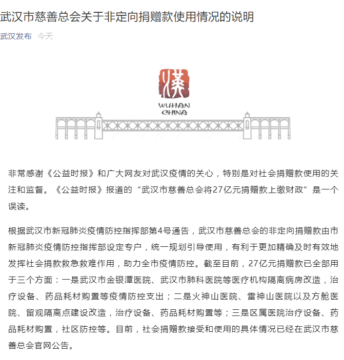 非常感谢《公益时报》和广大网友对武汉疫情的关心,特别是对社会捐赠款使用的关注和监督。《公益时报》报道的“武汉市慈善总会将27亿元捐赠款上缴财政”是一个误读。