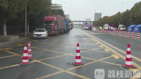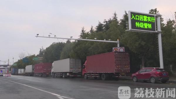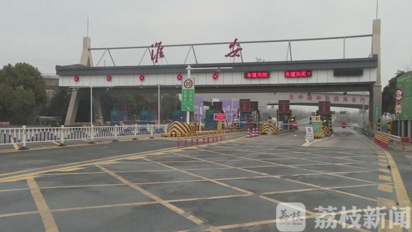 早上七点,记者在京沪高速江苏淮安出入口处看到,八个通道已全部关闭,收费站前的电子警示屏正滚动发布道路封闭的出行提醒。当地交管部门已经在距离高速入口两百米左右的地段安放隔离锥,引导车辆原地滞留。