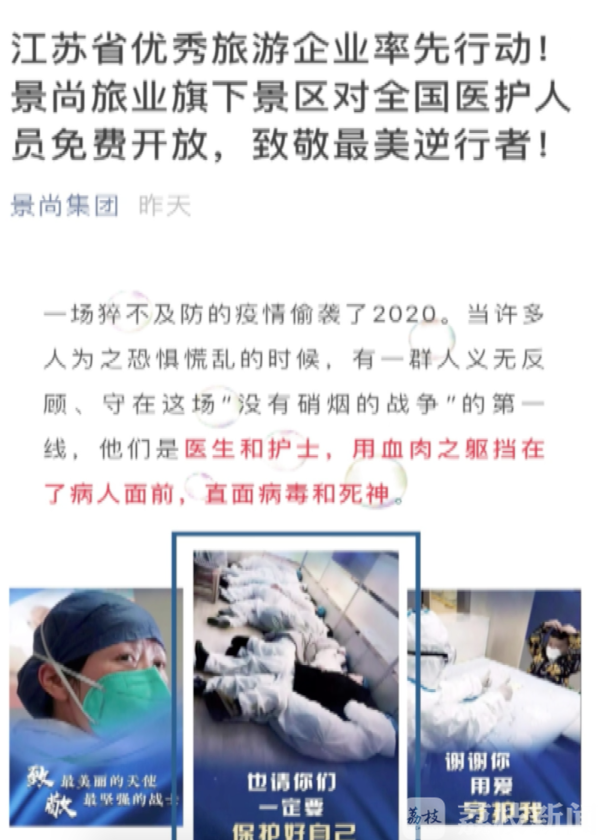 2月11日,景尚集团微信公众号发布消息:自恢复运营之日起至2020年12月31号,景尚旅业集团旗下常州金坛茅山宝盛园景区将对全国医护工作者实行免费开放特惠政策,这也是全省首家对外发布将对全国医护人员实行免费开放的景区。