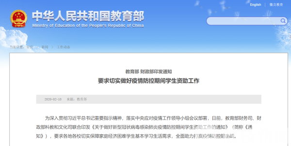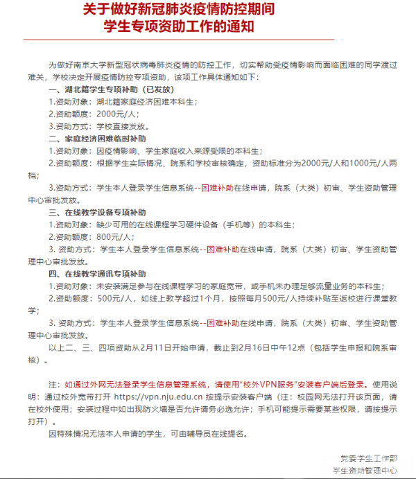 南京大学党委学生工作部也在11号表示,学校已开展疫情防控专项资助。其中,湖北籍学生专项补助的资助对象为湖北籍家庭经济困难本科生,资助额度为2000元/人,由学校直接发放,目前该项资助已完成发放。