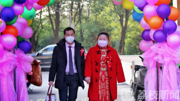 刘建春自掏腰包买了婚庆用品和一束玫瑰花,防控一线的工作人员和志愿者在现场搭建了拱门,布置了一个小仪式,这个简单得不能再简单的婚礼让一对新人惊喜万分。