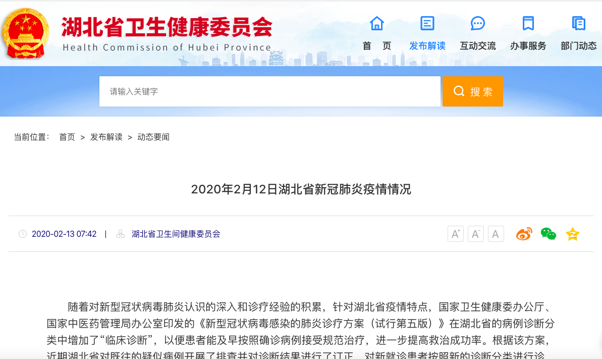 荔枝新闻讯 随着对新型冠状病毒肺炎认识的深入和诊疗经验的积累,针对湖北省疫情特点,国家卫生健康委办公厅、国家中医药管理局办公室印发的《新型冠状病毒感染的肺炎诊疗方案(试行第五版)》在湖北省的病例诊断分类中增加了“临床诊断”,以便患者能及早按照确诊病例接受规范治疗,进一步提高救治成功率。根据该方案,近期湖北省对既往的疑似病例开展了排查并对诊断结果进行了订正,对新就诊患者按照新的诊断分类进行诊断。为与全国其他省份对外发布的病例诊断分类一致,从今天起,湖北省将临床诊断病例数纳入确诊病例数进行公布。