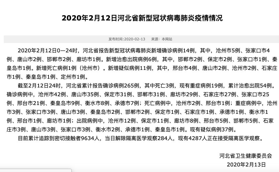截至2月12日24时,河北省累计报告确诊病例265例,其中死亡3例,现有重症病例19例,累计治愈出院54例。确诊病例中,沧州市42例、唐山市35例、保定市31例、邯郸市31例、廊坊市29例、石家庄市27例、张家口市25例、邢台市21例、秦皇岛市9例、衡水市8例、承德市7例;死亡病例中,沧州市2例、邢台市1例;重症病例中,沧州市3例、张家口市3例、唐山市3例、秦皇岛市2例、邯郸市2例、保定市1例、石家庄市1例、承德市1例、衡水市1例、邢台市1例、廊坊市1例;出院病例中,沧州市12例、保定市11例、廊坊市8例、邢台市5例、邯郸市5例、石家庄市3例、唐山市3例、张家口市3例、衡水市2例、承德市1例、秦皇岛市1例。现有疑似病例37例。
