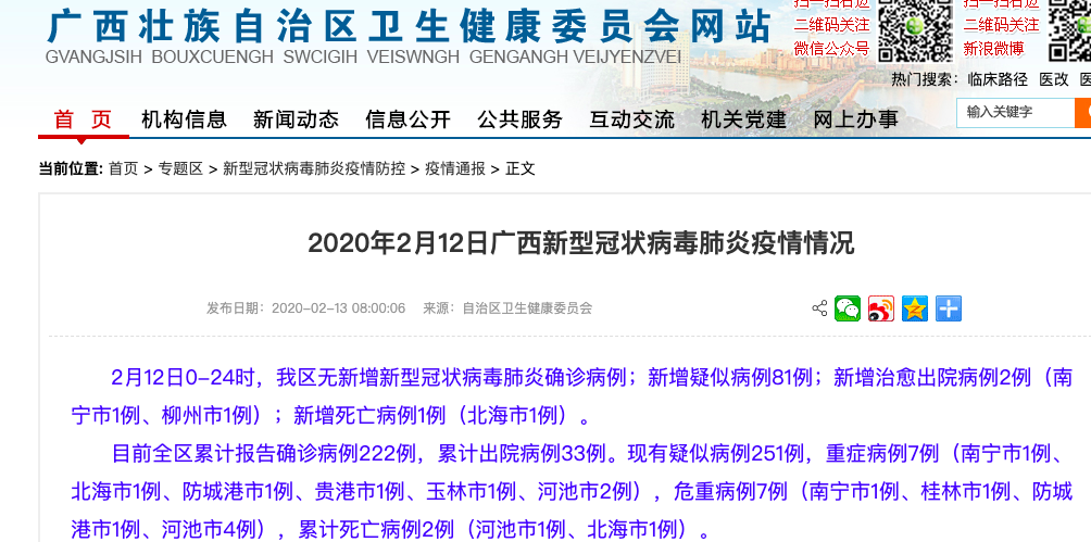目前全区累计报告确诊病例222例,累计出院病例33例。现有疑似病例251例,重症病例7例(南宁市1例、北海市1例、防城港市1例、贵港市1例、玉林市1例、河池市2例),危重病例7例(南宁市1例、桂林市1例、防城港市1例、河池市4例),累计死亡病例2例(河池市1例、北海市1例)。