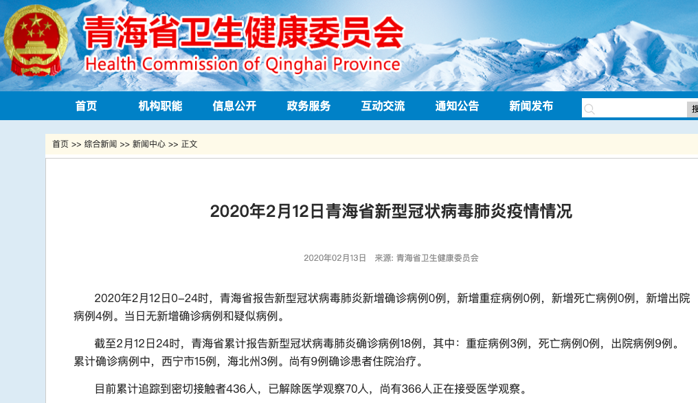 荔枝新闻讯 2020年2月12日0-24时,青海省报告新型冠状病毒肺炎新增确诊病例0例,新增重症病例0例,新增死亡病例0例,新增出院病例4例。当日无新增确诊病例和疑似病例。
