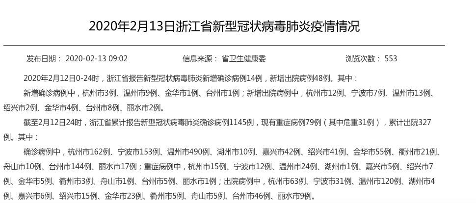 荔枝新闻讯 据浙江卫健委官方微信消息,2020年2月12日0-24时,浙江省报告新型冠状病毒肺炎新增确诊病例14例,新增出院病例48例。其中:新增确诊病例中,杭州市3例、温州市9例、金华市1例、台州市1例;新增出院病例中,杭州市12例、宁波市7例、温州市13例、绍兴市2例、金华市4例、台州市8例、丽水市2例。 截至2月12日24时,浙江省累计报告新型冠状病毒肺炎确诊病例1145例,现有重症病例79例(其中危重31例),累计出院327例。