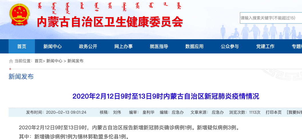 荔枝新闻讯 2020年2月12日9时至13日9时,内蒙古自治区报告新增新冠肺炎确诊病例1例。新增疑似病例3例。