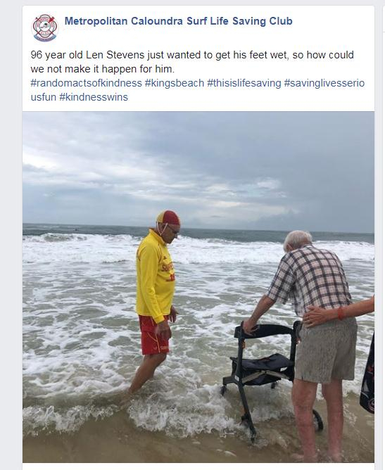 Caloundra冲浪救生俱乐部表示,“这位96岁的老人只是想用海水将脚弄湿,我们怎么能不帮他实现这个愿望呢?”。