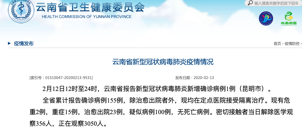 云南卫健委官网截图