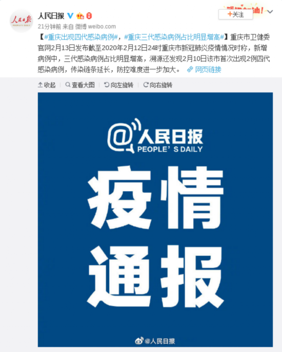 重庆市卫健委官网2月13日发布截至2020年2月12日24时重庆市新冠肺炎疫情情况时称,新增病例中,三代感染病例占比明显增高,溯源还发现2月10日该市首次出现2例四代感染病例,传染链条延长,防控难度进一步加大。