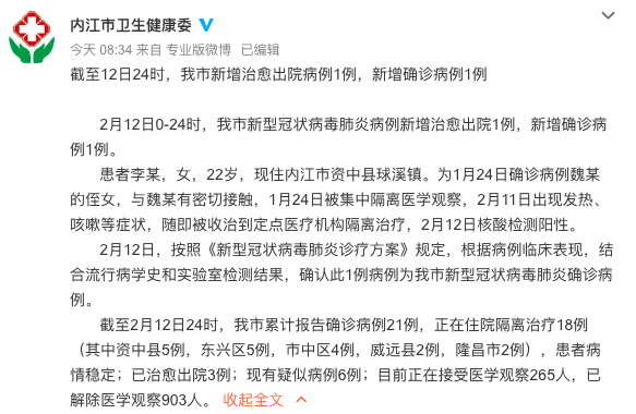 荔枝新闻讯 2月13日,四川@内江市卫生健康委 通报,新增1例确诊病例患者,是在被集中隔离医学观察第19天出现症状,随后被确诊的。患者李某,女,22岁,现住内江市资中县球溪镇。为1月24日确诊病例魏某的侄女,与魏某有密切接触,1月24日被集中隔离医学观察,2月11日出现发热、咳嗽等症状,随即被收治到定点医疗机构隔离治疗,2月12日核酸检测阳性。