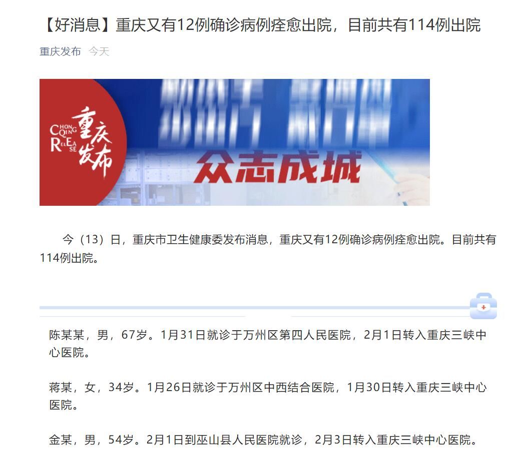 荔枝新闻讯 据重庆发布微信公众号消息,今日(2月13日),重庆市卫生健康委发布消息,重庆又有12例确诊病例痊愈出院。目前共有114例出院。