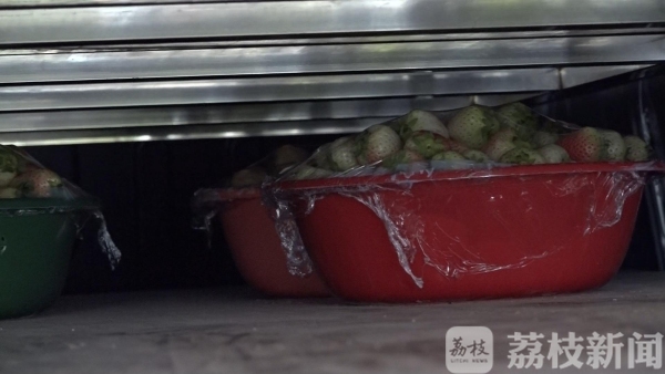 早上9点钟,装运草莓的车辆已经停放到盐城交警支队高速二大队的院子里,车厢里还剩下几盆带青的草莓,其余装草莓的塑料盆都已经空了。