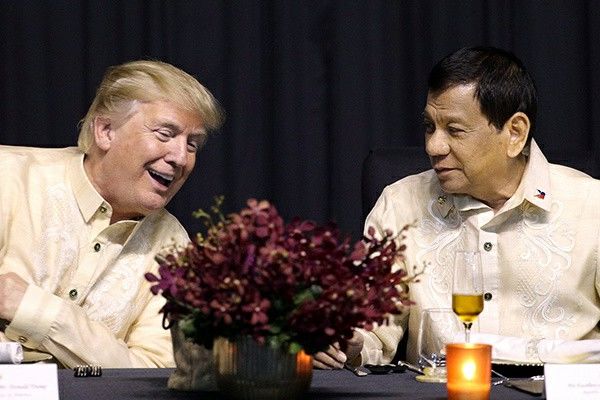 资料图:美国总统特朗普和菲律宾总统杜特尔特在东盟50周年庆祝晚宴上交谈(视觉中国)