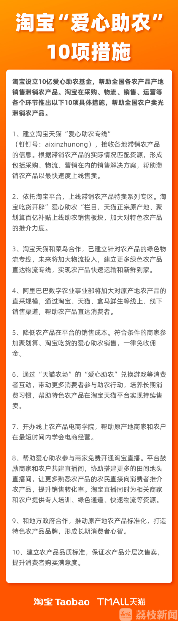 2月11号,阿里巴巴也发布了“爱心助农”10项措施。2月12号,又宣布成立10亿元助农基金,建设针对农产品的绿色物流专线,加大对农产品的直采规模,通过盒马等线上线下渠道触达消费者。对于符合条件,参加相关促销活动的商家,一律免收佣金(淘宝爱心助农专线钉钉号:aixinzhunong)。