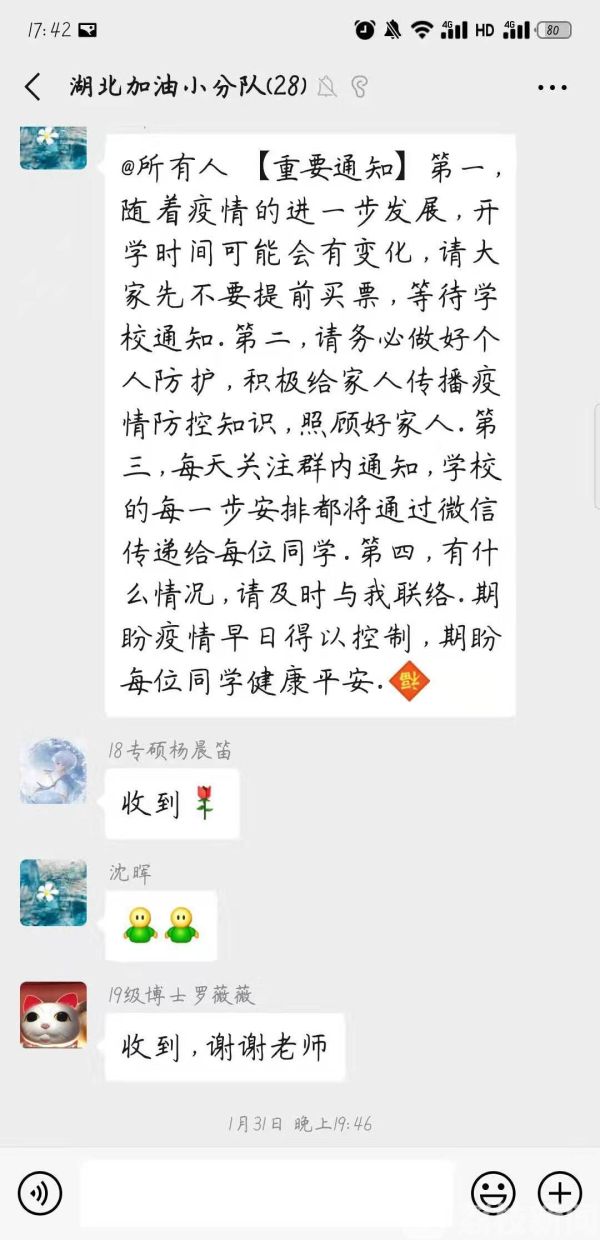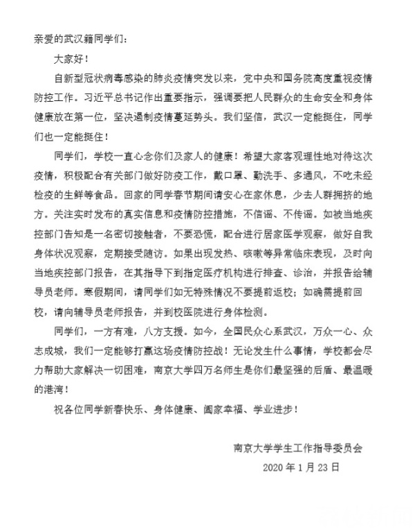 南京大学学工处要求辅导员和每一位湖北籍的同学每天保持联系,以院系为单位组建湖北籍同学微信、QQ群,随时了解他们的身体状况,同时为他们加油鼓劲,帮助他们渡过难关。