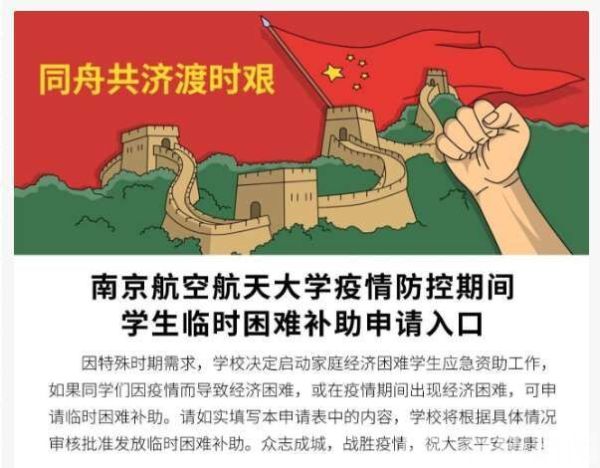 南京航空航天大学为了保证临时困难补贴第一时间发放到因疫情导致经济困难的学生手中,特别开通了网络申请通道。目前,首批临时困难补贴发放到510名学生手中。