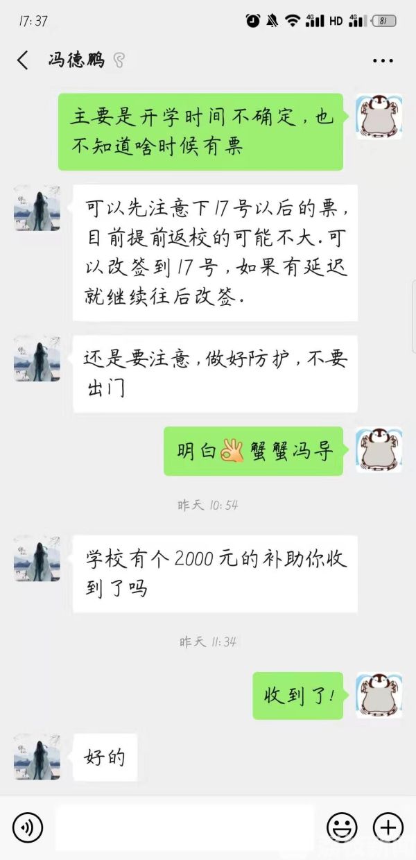 陈同学说,疫情肆虐,但是全国各地支援武汉的热情让他动容,南京大学也第一时间发来了慰问信,辅导员每天都关心他的身体情况,他还收到了学校2000元专项资助。