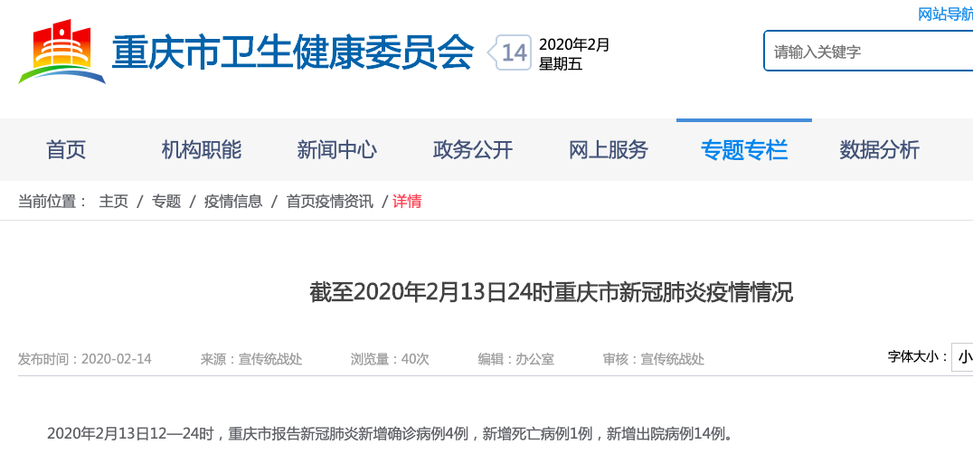 荔枝新闻讯 2020年2月13日12—24时,重庆市报告新冠肺炎新增确诊病例4例,新增死亡病例1例,新增出院病例14例。