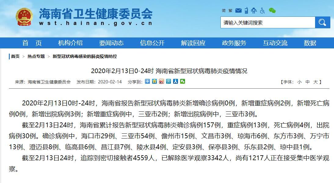 截至2月13日24时,海南省累计报告新冠肺炎确诊病例157例,重症病例13例,死亡病例4例,出院病例30例。确诊病例中,海口市29例、三亚市54例、儋州市15例、文昌市3例、琼海市6例、东方市3例、万宁市13例、澄迈县8例、临高县6例、昌江县7例、陵水县4例、定安县3例、保亭县3例、乐东县2例、琼中县1例。