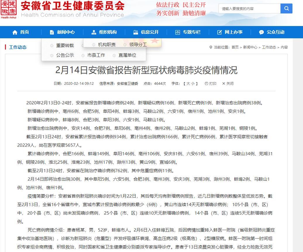 截至2月13日24时,安徽省累计报告确诊病例934例,累计治愈出院病例166例,累计死亡病例6例,累计医学观察密切接触者20229人,尚在医学观察5657人。