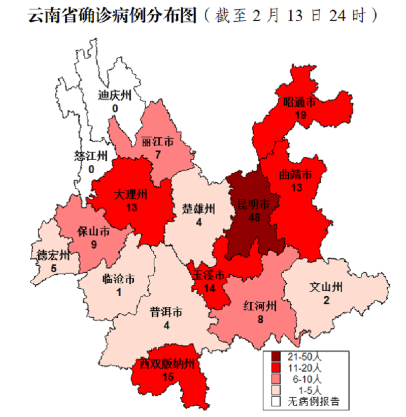 确诊病例中,昆明市48例、昭通市19例、西双版纳州15例、玉溪市14例、曲靖市13例、大理州13例、保山市9例、红河州8例、丽江市7例、德宏州5例、楚雄州4例、普洱市4例、文山州2例、临沧市1例。