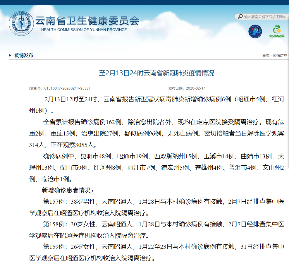 第159例:26岁女性,云南昭通人,1月22至23日与本村确诊病例有接触,31日经排查集中医学观察后在昭通医疗机构收治入院隔离治疗。