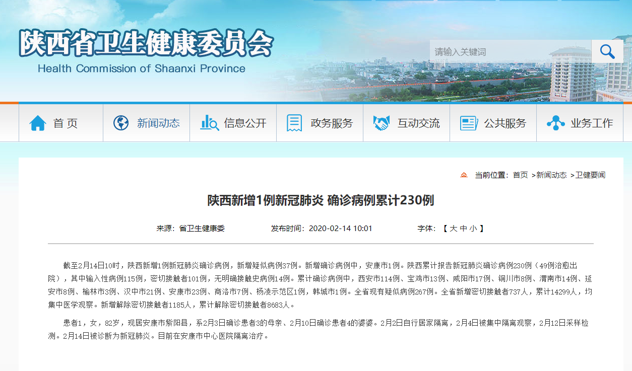 荔枝新闻讯 截至2月14日10时,陕西新增1例新冠肺炎确诊病例,新增疑似病例37例。新增确诊病例中,安康市1例。陕西累计报告新冠肺炎确诊病例230例(49例治愈出院),其中输入性病例115例,密切接触者101例,无明确接触史病例14例。累计确诊病例中,西安市114例、宝鸡市13例、咸阳市17例、铜川市8例、渭南市14例、延安市8例、榆林市3例、汉中市21例、安康市23例、商洛市7例、杨凌示范区1例,韩城市1例。全省现有疑似病例267例。全省新增密切接触者737人,累计14299人,均集中医学观察。新增解除密切接触者1185人,累计解除密切接触者8683人。
