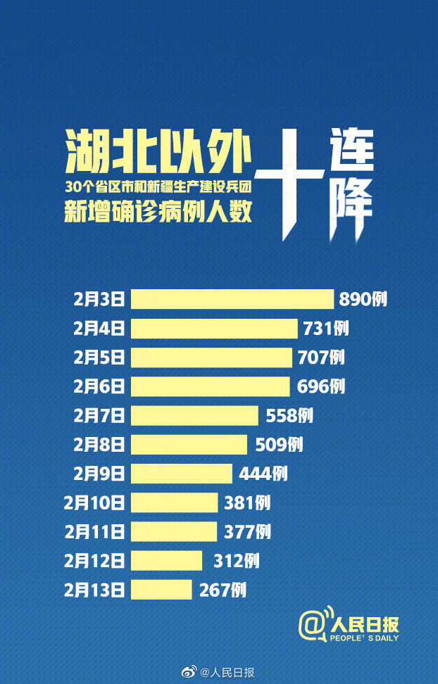 据国家卫健委数据统计,2月13日0-24时,全国湖北以外地区新增确诊病例267例,连续第10日呈下降态势。过去这一数据分别为:890例(3日)、731例(4日)、707例(5日)、696例(6日)、558例(7日)、509例(8日)、444例(9日)、381例(10日)、377例(11日),312例(12日)。