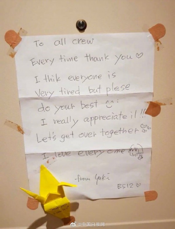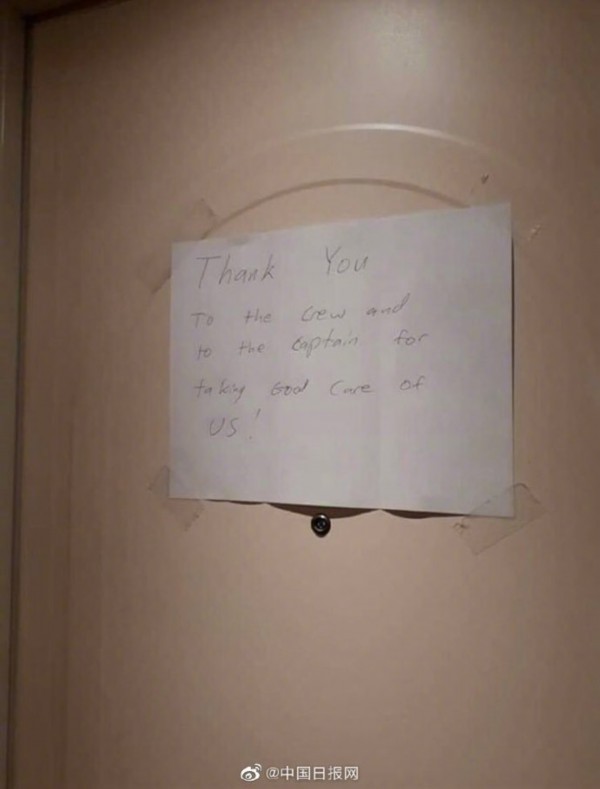 据日本NHK新闻报道,截至2月13日,停靠在日本横滨港的“钻石公主号”邮轮上已有218人被确认感染新型冠状肺炎,包括11名船员。据悉,船上共有3700人,大约1000名戴口罩和手套的船员还坚守在工作岗位上,与有可能被感染的乘客进行沟通交流。一些乘客也意识到了工作人员所面临的的困难,有的乘客将感谢的话写在纸上,贴在自己房间的门上,表达对工作人员的支持。推特网友Tina将这些照片发到网上并表示,一直到去年夏天,她都在“钻石公主号”上工作,看到媒体的负面报道让她很难过。“事实上,每个人都对彼此心怀感激,尽最大的努力做好自己的事情。这些照片是一位现在在船上工作的朋友发给我的。”她写道。