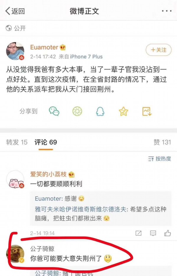 14日17时42分,微博网友“Euamoter”发文称,自己“从没觉得我爸有多大本事,当了一辈子官我没沾到一点好处,直到这次疫情,在全省封路的情况下,通过他的关系派车把我从天门接回荆州。”
